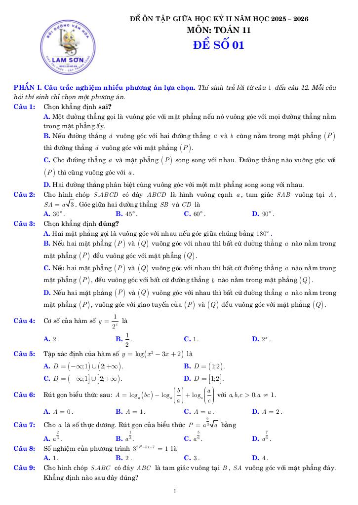 Toán học luôn là một môn học quan trọng, giúp học sinh phát triển tư duy logic và kỹ năng giải quyết vấn đề. Để hỗ trợ các bạn học sinh và giáo viên trong việc học tập và giảng dạy, bài viết này sẽ cung cấp lời giải chi tiết và đáp án chính xác cho chủ đề 04 đề ôn tập giữa học kỳ 2 môn toán 11 năm 2025 – 2026 có đáp án và lời giải, giúp bạn hiểu sâu và tự tin hơn khi làm bài tập.