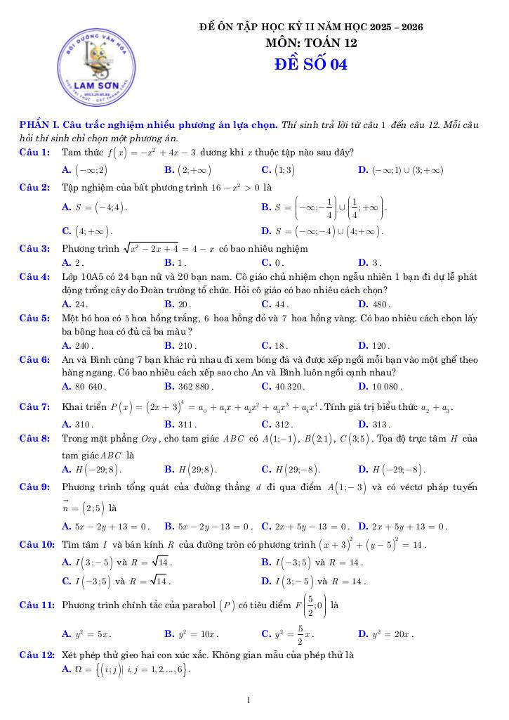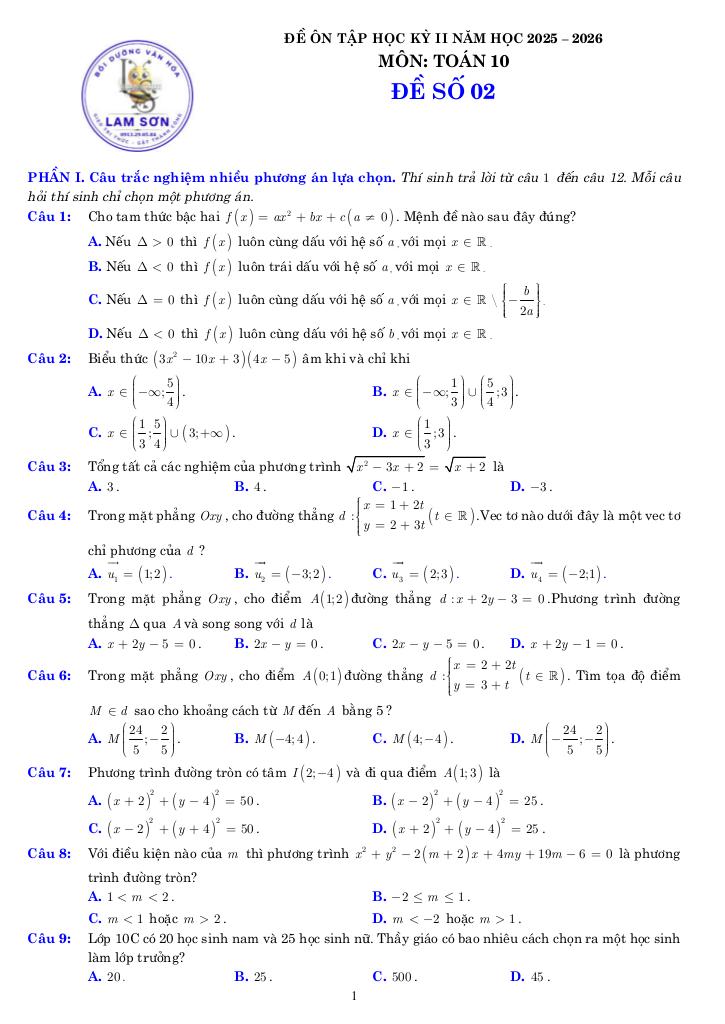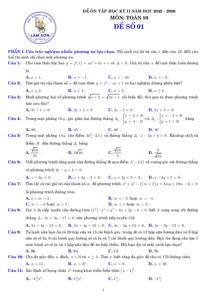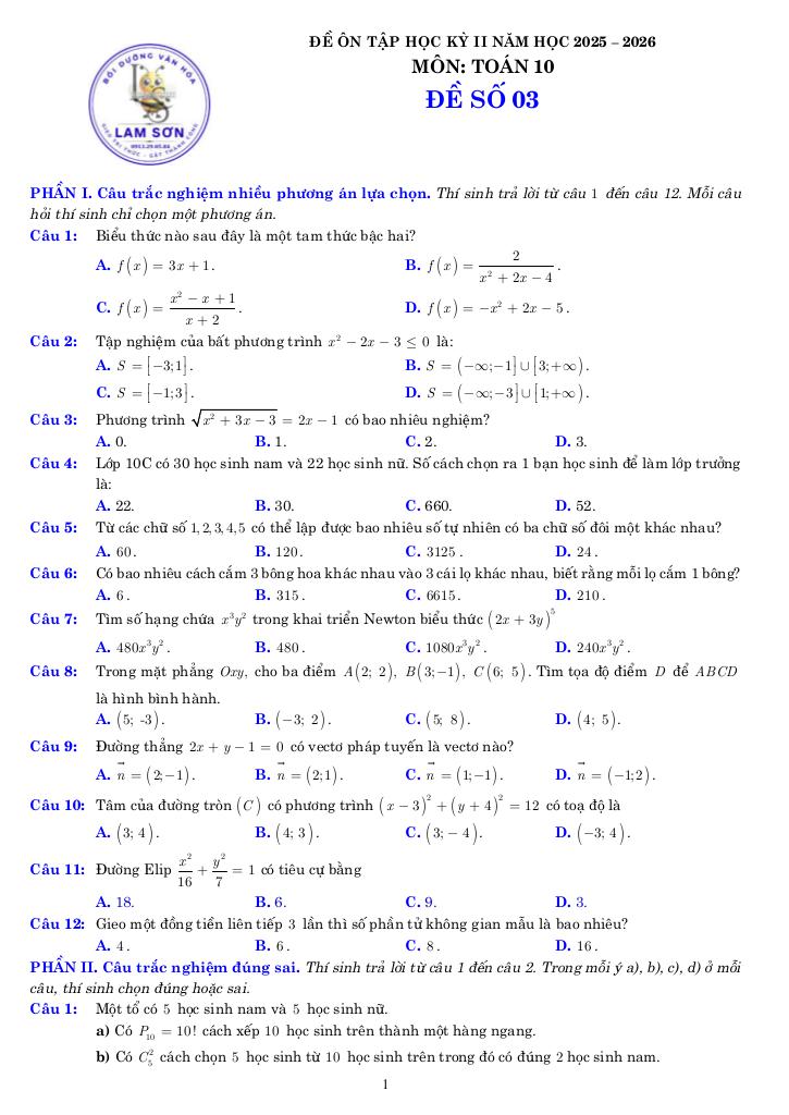 Tài liệu gồm 70 trang, được biên soạn bởi Trung Tâm Bồi Dưỡng Văn Hóa Lam Sơn, tuyển tập 10 đề ôn tập kiểm tra cuối học kỳ 2 môn Toán 10 năm học 2025 – 2026 theo cấu trúc mới nhất 3-2-2-3.