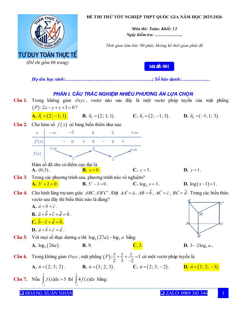 Bộ đề được xây dựng theo cấu trúc và định hướng ra đề mới nhất, giúp học sinh làm quen với dạng thức đề thi chính thức. Đề thi bao quát các chuyên đề trọng tâm của chương trình Toán THPT, đặc biệt là kiến thức lớp 12, với mức độ câu hỏi có sự phân hóa rõ ràng từ cơ bản đến nâng cao. Qua việc luyện tập, học sinh có thể củng cố kiến thức, nâng cao kỹ năng giải toán, rèn tư duy logic và cải thiện khả năng xử lý các câu hỏi vận dụng, vận dụng cao.
