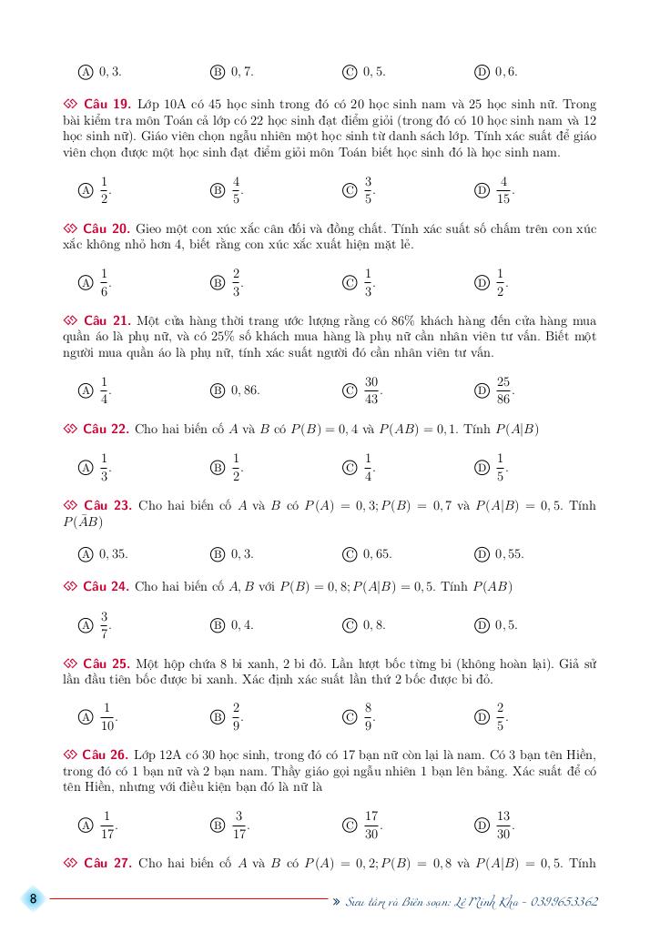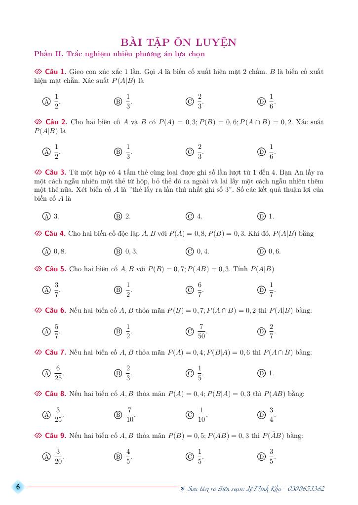 Toán học luôn là một môn học quan trọng, giúp học sinh phát triển tư duy logic và kỹ năng giải quyết vấn đề. Để hỗ trợ các bạn học sinh và giáo viên trong việc học tập và giảng dạy, bài viết này sẽ cung cấp lời giải chi tiết và đáp án chính xác cho chủ đề bài tập xác suất có điều kiện có đáp án và hướng dẫn giải – lê minh kha, giúp bạn hiểu sâu và tự tin hơn khi làm bài tập.