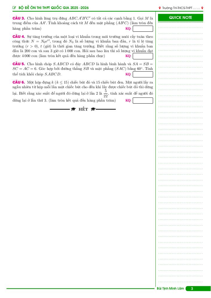 Đề 110: Đề thi thử tốt nghiệp THPT — Sở Ninh Bình – Lần 3 – 2025 555.