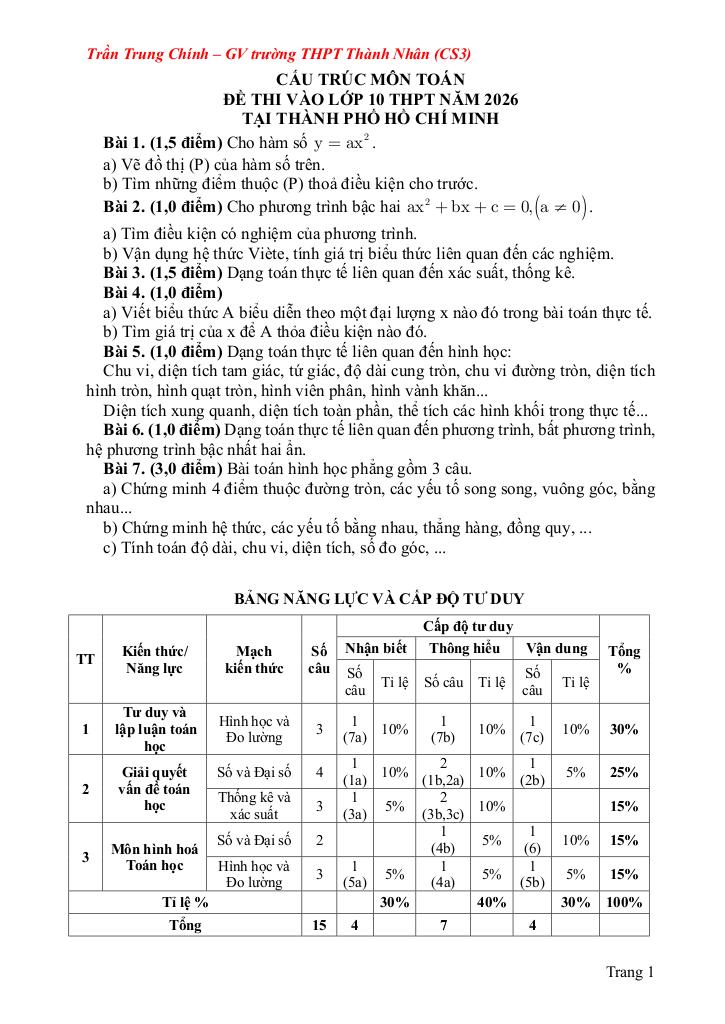 CẤU TRÚC ĐỀ THI VÀO LỚP 10 THPT MÔN TOÁN NĂM 2026 TẠI THÀNH PHỐ HỒ CHÍ MINH: