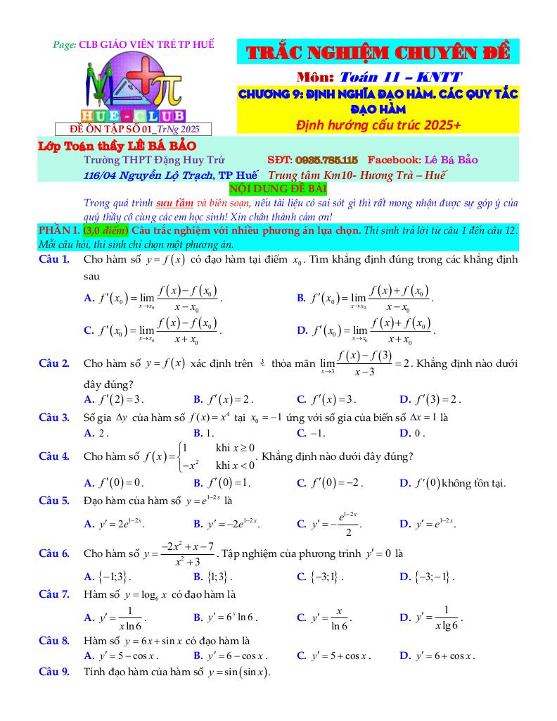 bộ đề ôn tập chuyên đề đạo hàm môn toán 11 – lê bá bảo là một trong những phần kiến thức quan trọng trong chương trình toán học, thường xuất hiện trong các bài kiểm tra và kỳ thi lớn. Việc nắm vững phần này không chỉ giúp bạn đạt điểm cao mà còn tạo nền tảng vững chắc để học các nội dung nâng cao hơn.