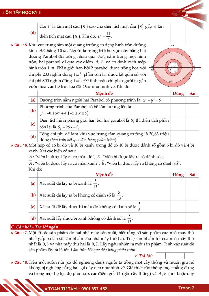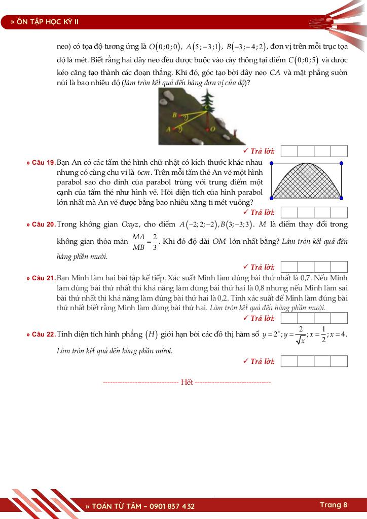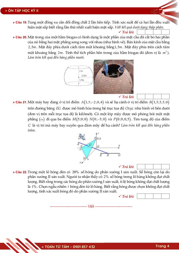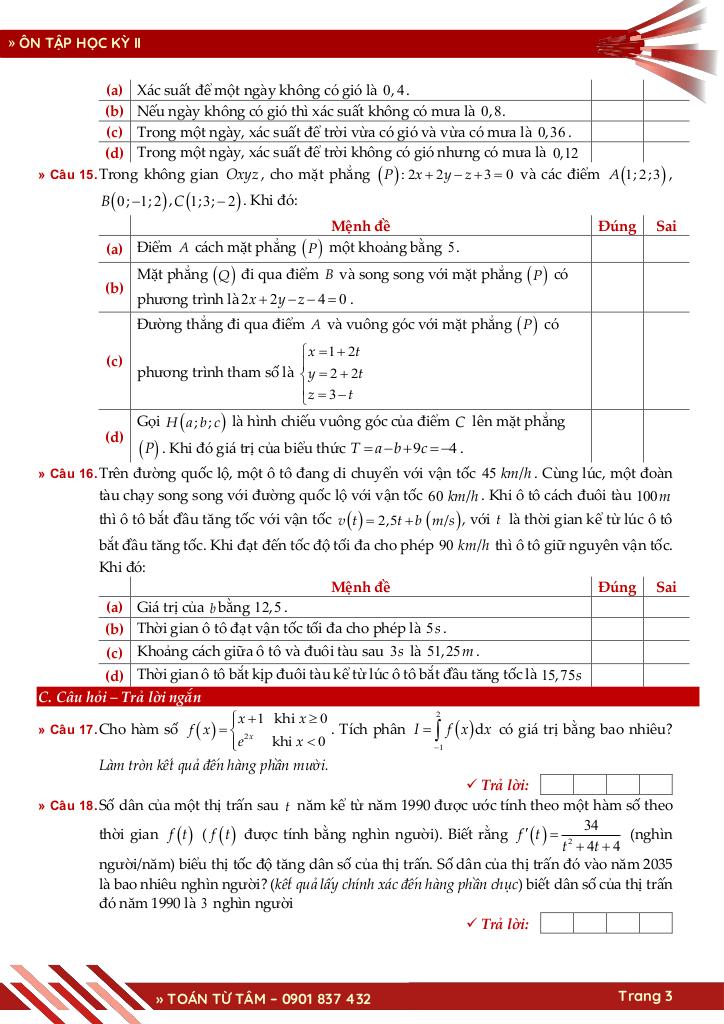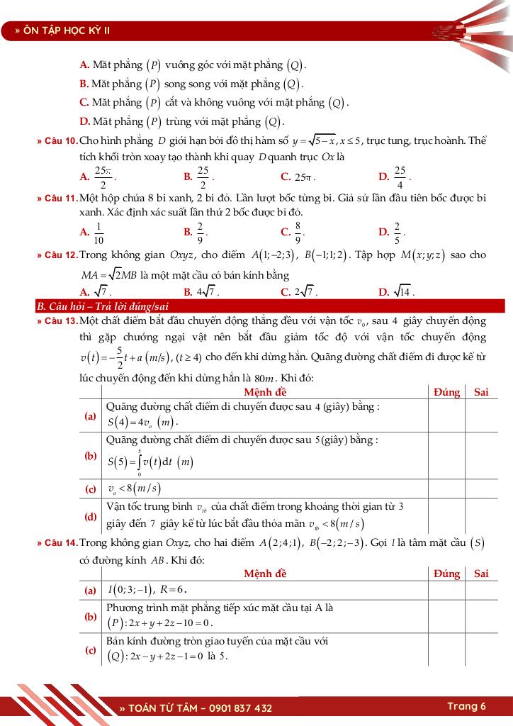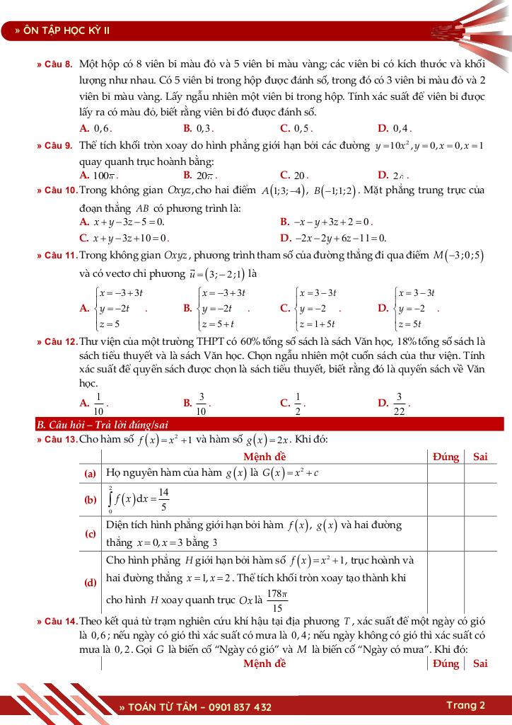 Tài liệu hỗ trợ học sinh lớp 12 hệ thống hóa toàn bộ kiến thức môn Toán trọng tâm của học kỳ II, đồng thời rèn luyện kỹ năng làm bài một cách hiệu quả và khoa học. Nội dung tài liệu bao gồm nhiều đề ôn tập được xây dựng bám sát chương trình giáo dục hiện hành, phản ánh đúng cấu trúc và mức độ của đề kiểm tra thực tế, giúp học sinh làm quen với dạng đề và áp lực thời gian khi làm bài.