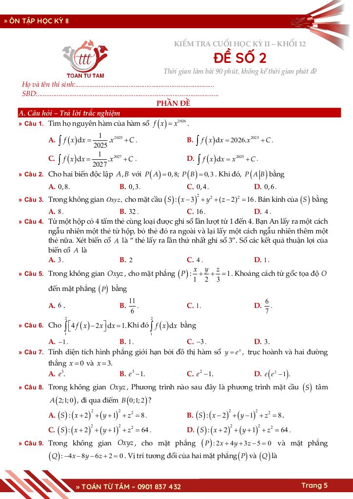 Toán học luôn là một môn học quan trọng, giúp học sinh phát triển tư duy logic và kỹ năng giải quyết vấn đề. Để hỗ trợ các bạn học sinh và giáo viên trong việc học tập và giảng dạy, bài viết này sẽ cung cấp lời giải chi tiết và đáp án chính xác cho chủ đề bộ đề ôn tập kiểm tra cuối học kỳ 2 môn toán 12 năm 2025 – 2026, giúp bạn hiểu sâu và tự tin hơn khi làm bài tập.