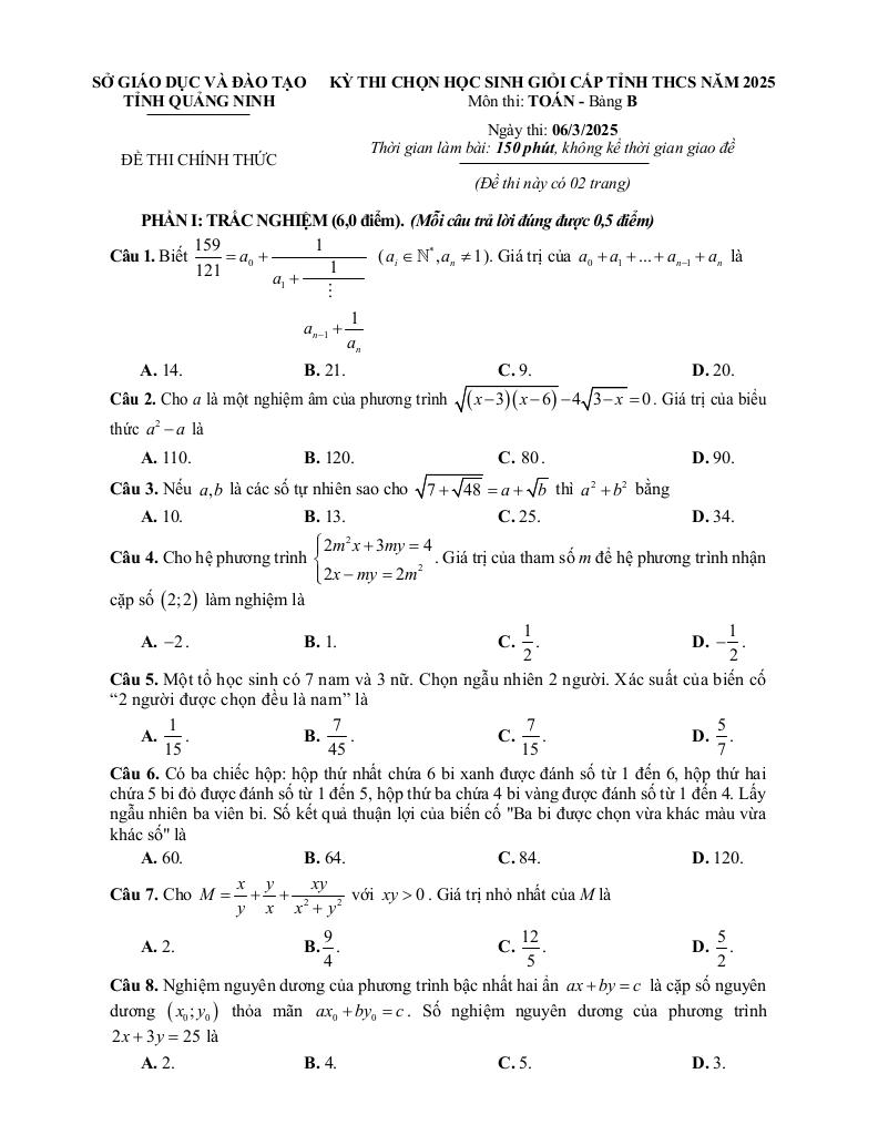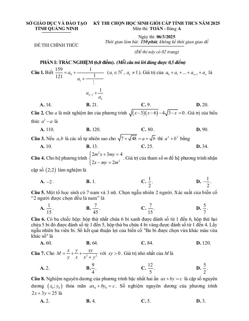 Giải Toán đề chọn học sinh giỏi cấp tỉnh toán thcs năm 2025 sở gd&đt quảng ninh với Đáp Án Mới Nhất