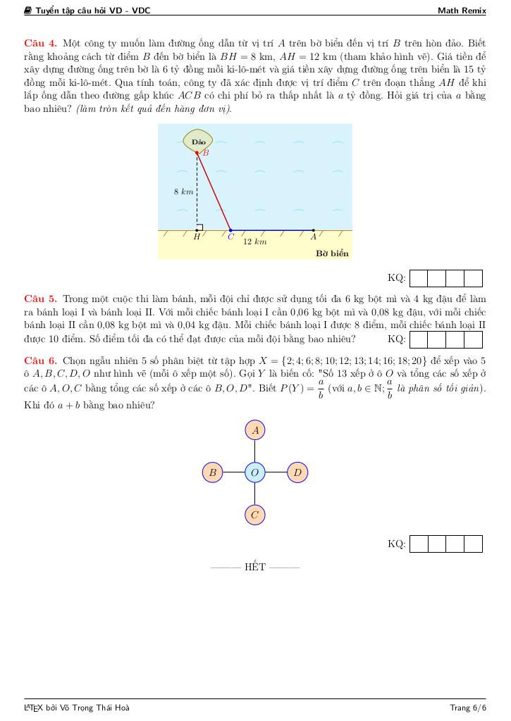 + Một công ty muốn làm đường ống dẫn từ vị trí A trên bờ biển đến vị trí B trên hòn đảo. Biết rằng khoảng cách từ điểm B đến bờ biển là BH = 8 km, AH = 12 km (tham khảo hình vẽ). Giá tiền để xây dựng đường ống trên bờ là 6 tỷ đồng mỗi ki-lô-mét và giá tiền xây dựng đường ống trên biển là 15 tỷ đồng mỗi ki-lô-mét. Qua tính toán, công ty đã xác định được vị trí điểm C trên đoạn thẳng AH để khi lắp ống dẫn theo đường gấp khúc ACB có chi phí bỏ ra thấp nhất là a tỷ đồng. Hỏi giá trị của a bằng bao nhiêu? (làm tròn kết quả đến hàng đơn vị).