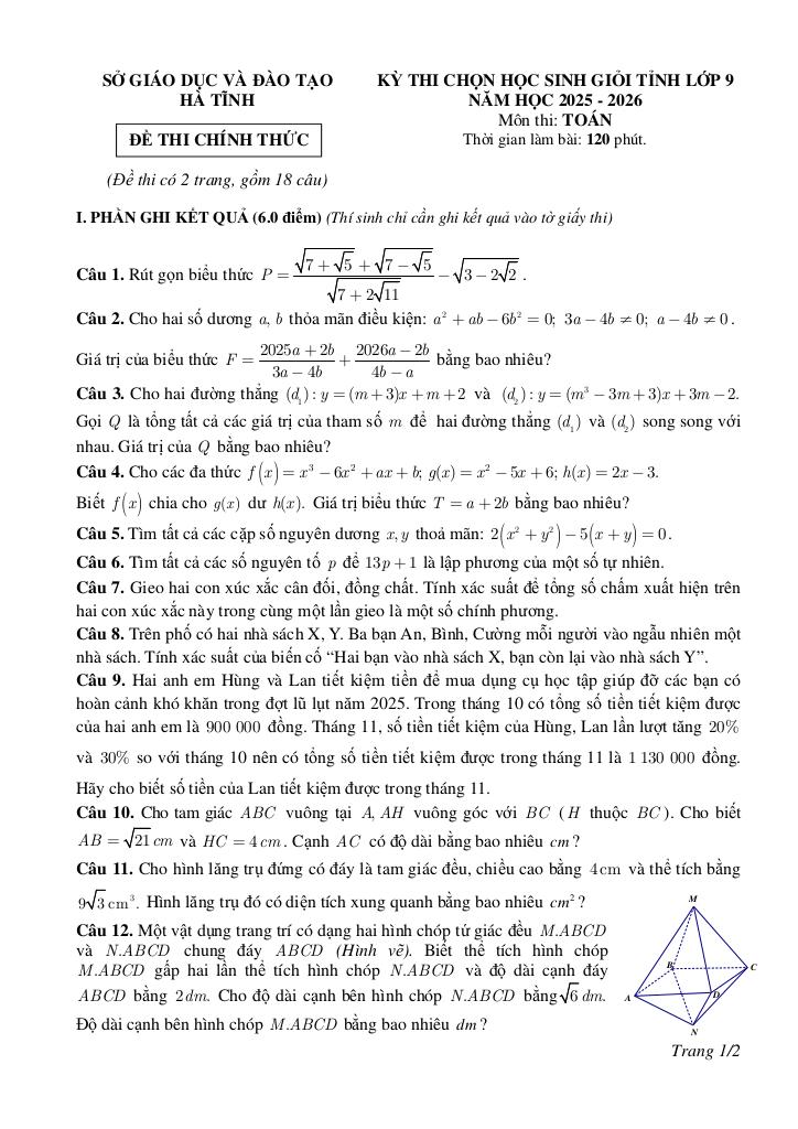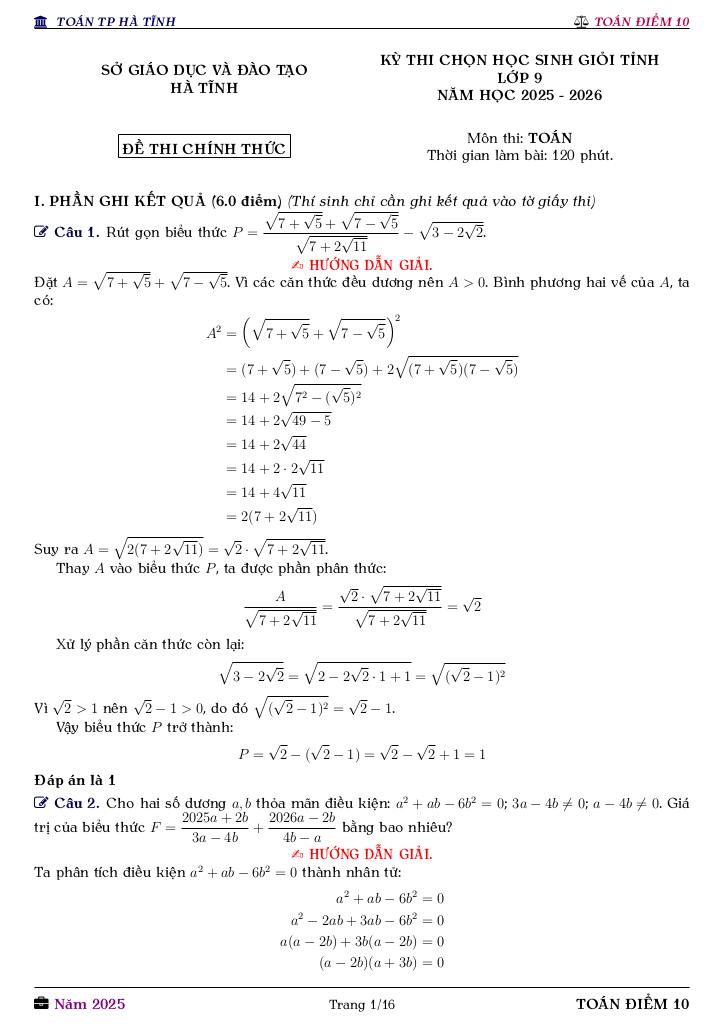 Toán học luôn là một môn học quan trọng, giúp học sinh phát triển tư duy logic và kỹ năng giải quyết vấn đề. Để hỗ trợ các bạn học sinh và giáo viên trong việc học tập và giảng dạy, bài viết này sẽ cung cấp lời giải chi tiết và đáp án chính xác cho chủ đề đề chọn học sinh giỏi tỉnh toán 9 năm 2025 – 2026 sở gd&đt hà tĩnh, giúp bạn hiểu sâu và tự tin hơn khi làm bài tập.