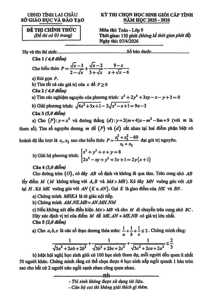 Trích dẫn Đề chọn học sinh giỏi tỉnh Toán 9 năm 2025 – 2026 sở GD&ĐT Lai Châu: