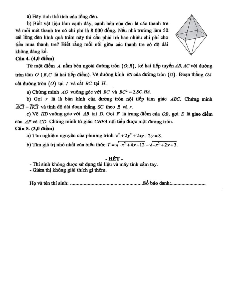 + Để góp phần vào việc trang trí dịp Tết cổ truyền Chôl Chnam Thmây của đồng bào dân tộc Khmer được diễn ra vào các ngày giữa tháng 4 năm 2026, Trường Phổ thông Dân tộc nội trú THCS Ngũ Lạc phát động các em học sinh của trường cùng nhau làm lồng đèn hình quả trám (hình vẽ). Một cái lồng đèn hình quả trám là hình ghép từ hai hình chóp tứ giác đều có cạnh đáy là 24 cm, cạnh bên bằng 4/3 cạnh đáy, khoảng cách giữa hai đỉnh của hai hình chóp là 36 cm. a) Hãy tính thể tích của lồng đèn. b) Biết vật liệu làm cạnh đáy, cạnh bên của đèn là các thanh tre và mỗi mét thanh tre có chi phí là 8 000 đồng. Nếu nhà trường làm 50 cái lồng đèn hình quả trám này thì cần phải trả bao nhiêu chi phí cho tiền mua thanh tre? Biết rằng mối nối giữa các thanh tre có độ dài không đáng kể.