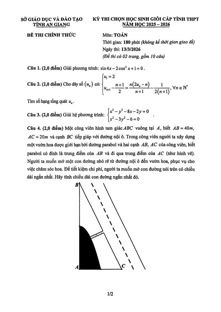 giaitoan.edu.vn giới thiệu đến quý thầy, cô giáo và các em học sinh đề thi chọn học sinh giỏi cấp tỉnh môn Toán THPT năm học 2025 – 2026 sở Giáo dục và Đào tạo tỉnh An Giang. Kỳ thi được diễn ra vào ngày 13 tháng 03 năm 2026.