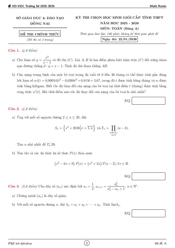 Toán học luôn là một môn học quan trọng, giúp học sinh phát triển tư duy logic và kỹ năng giải quyết vấn đề. Để hỗ trợ các bạn học sinh và giáo viên trong việc học tập và giảng dạy, bài viết này sẽ cung cấp lời giải chi tiết và đáp án chính xác cho chủ đề đề chọn học sinh giỏi tỉnh toán thpt năm 2025 – 2026 sở gd&đt đồng nai, giúp bạn hiểu sâu và tự tin hơn khi làm bài tập.