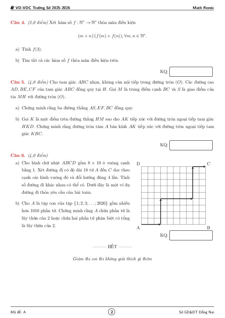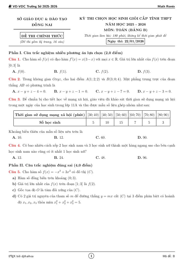 Trích dẫn Đề chọn học sinh giỏi tỉnh Toán THPT năm 2025 – 2026 sở GD&ĐT Đồng Nai: