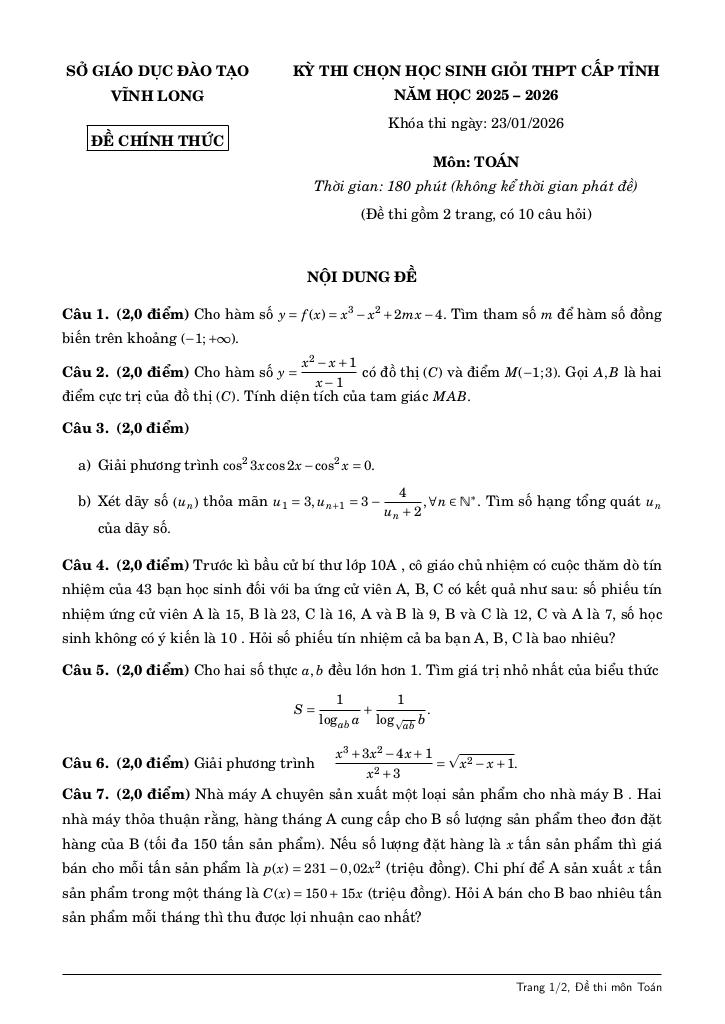 Giải Toán đề chọn học sinh giỏi tỉnh toán thpt năm 2025 – 2026 sở gd&đt vĩnh long với Đáp Án Mới Nhất