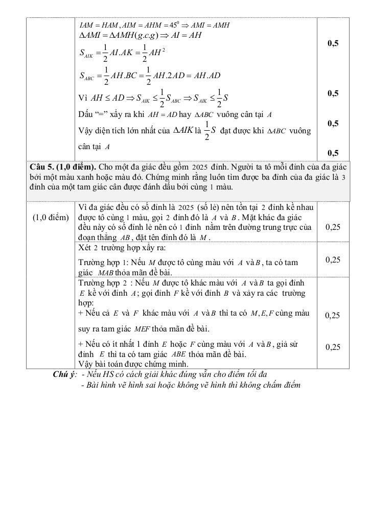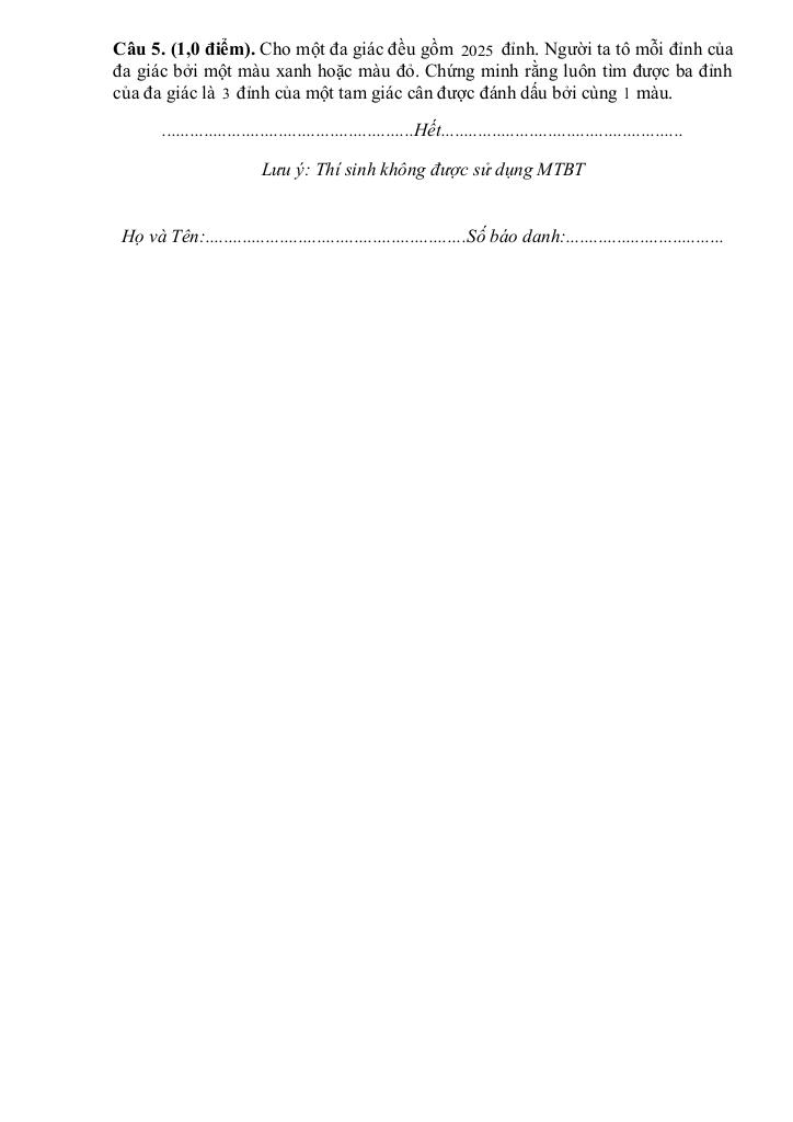 + Cho một đa giác đều gồm 2025 đỉnh. Người ta tô mỗi đỉnh của đa giác bởi một màu xanh hoặc màu đỏ. Chứng minh rằng luôn tìm được ba đỉnh của đa giác là 3 đỉnh của một tam giác cân được đánh dấu bởi cùng 1 màu.