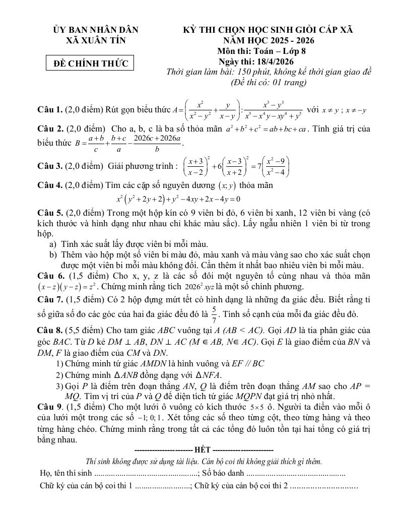 giaitoan.edu.vn giới thiệu đến quý thầy, cô giáo và các em học sinh đề thi chọn học sinh giỏi cấp xã môn Toán 8 năm học 2025 – 2026 xã Xuân Tín, tỉnh Thanh Hóa. Kỳ thi được diễn ra vào ngày 18 tháng 04 năm 2026. Đề thi có đáp án, lời giải chi tiết và hướng dẫn chấm điểm.