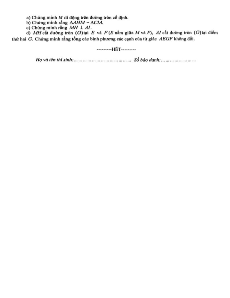 + Cho điểm A di chuyển trên đường tròn (O), đường kính BC = 2R (A không trùng với B và C). Trên tia AB lấy điểm M sao cho B là trung điểm của AM. Gọi H là hình chiếu vuông góc của A lên BC và I là trung điểm của HC. a) Chứng minh M di động trên đường tròn cố định. b) Chứng minh rằng AНМ ~ СІА. c) Chứng minh rằng MH vuông góc AI. d) MH cắt đường tròn (O)tại E và F (E nằm giữa M và F), AI cắt đường tròn (O) tại điểm thứ hai G. Chứng minh rằng tổng các bình phương các cạnh của tứ giác AEGF không đổi.