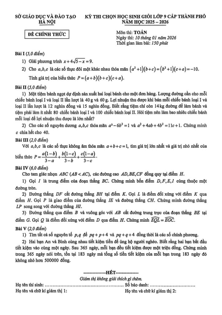 giaitoan.edu.vn giới thiệu đến quý thầy, cô giáo và các em học sinh đề thi chọn học sinh giỏi môn Toán 9 cấp thành phố năm học 2025 – 2026 sở Giáo dục và Đào tạo thành phố Hà Nội. Kỳ thi được diễn ra vào ngày 10 tháng 01 năm 2026. Đề thi có đáp án và lời giải chi tiết.