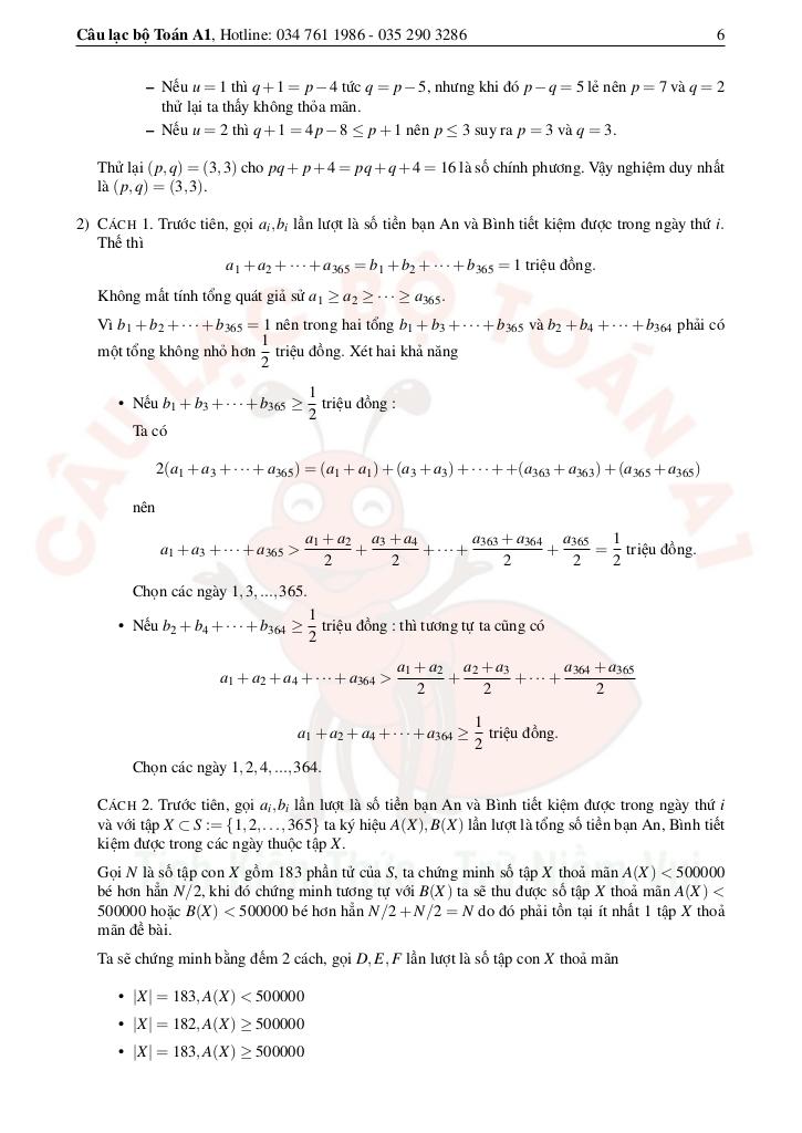 + Hai bạn An và Bình cùng nhau tiết kiệm tiền để ủng hộ người nghèo. Biết rằng hai bạn bắt đầu tiết kiệm vào cùng một ngày. Sau 365 ngày, mỗi bạn đều tiết kiệm được một triệu đồng. Chứng minh trong 365 ngày nói trên, tồn tại 183 ngày mà tổng số tiền tiết kiệm của mỗi bạn trong 183 ngày đó không nhỏ hơn 500000 đồng.