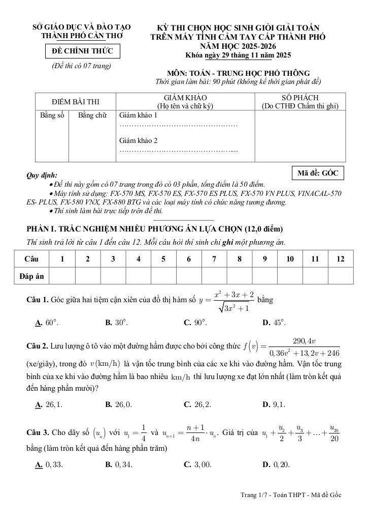 giaitoan.edu.vn giới thiệu đến quý thầy, cô giáo và các em học sinh đề thi chọn học sinh giỏi giải toán THPT trên máy tính cầm tay cấp thành phố năm học 2025 – 2026 sở Giáo dục và Đào tạo thành phố Cần Thơ. Kỳ thi được diễn ra vào ngày 29 tháng 11 năm 2025.