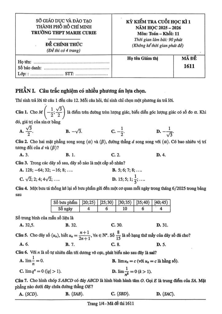 Toán học luôn là một môn học quan trọng, giúp học sinh phát triển tư duy logic và kỹ năng giải quyết vấn đề. Để hỗ trợ các bạn học sinh và giáo viên trong việc học tập và giảng dạy, bài viết này sẽ cung cấp lời giải chi tiết và đáp án chính xác cho chủ đề đề cuối học kì 1 toán 11 năm 2025 – 2026 trường thpt marie curie – tp hcm, giúp bạn hiểu sâu và tự tin hơn khi làm bài tập.