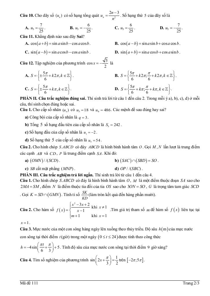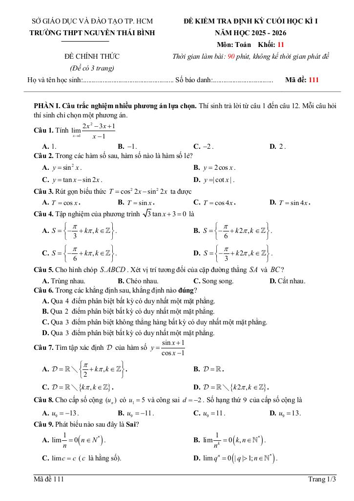 Toán học luôn là một môn học quan trọng, giúp học sinh phát triển tư duy logic và kỹ năng giải quyết vấn đề. Để hỗ trợ các bạn học sinh và giáo viên trong việc học tập và giảng dạy, bài viết này sẽ cung cấp lời giải chi tiết và đáp án chính xác cho chủ đề đề cuối học kì 1 toán 11 năm 2025 – 2026 trường thpt nguyễn thái bình – tp hcm, giúp bạn hiểu sâu và tự tin hơn khi làm bài tập.