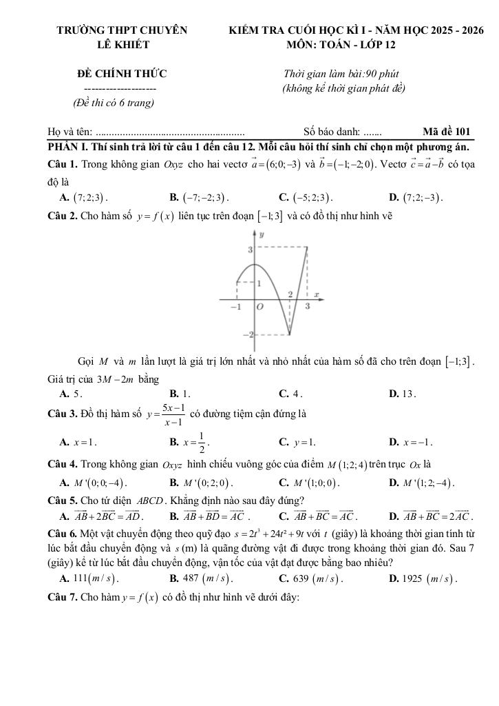 Trích dẫn Đề cuối học kì 1 Toán 12 năm 2025 – 2026 trường chuyên Lê Khiết – Quảng Ngãi:
