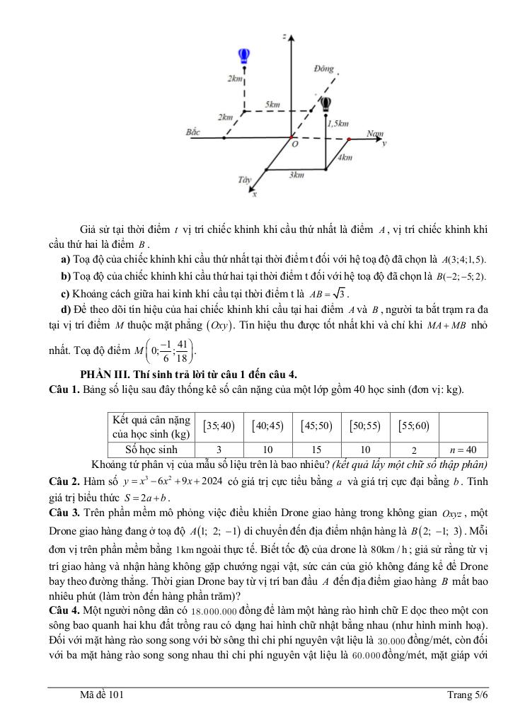 + Trên phần mềm mô phỏng việc điều khiển Drone giao hàng trong không gian Oxyz, một Drone giao hàng đang ở toạ độ A(1; 2; -1) di chuyển đến địa điểm nhận hàng là B(2; -1; 3). Mỗi đơn vị trên phần mềm bằng 1km ngoài thực tế. Biết tốc độ của drone là 80km / h; giả sử rằng từ vị trí giao hàng và nhận hàng không gặp chướng ngại vật, sức cản của gió không đáng kể để Drone bay theo đường thẳng. Thời gian Drone bay từ vị trí ban đầu A đến địa điểm giao hàng B mất bao nhiêu phút (làm tròn đến hàng phần trăm)?
