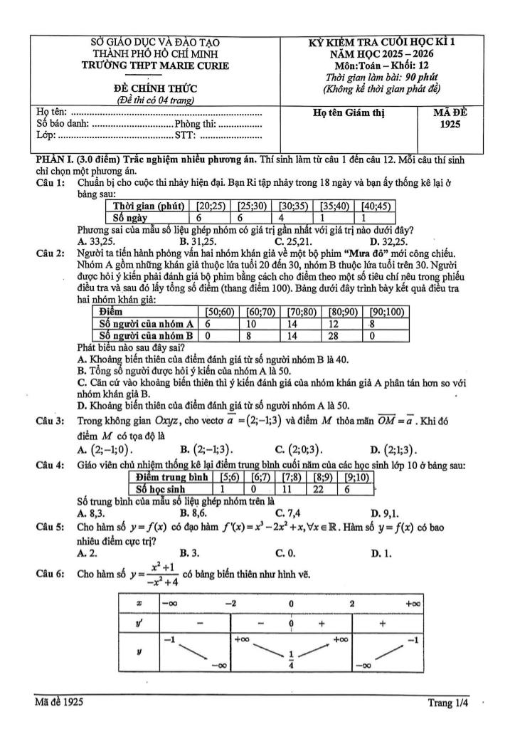 Trích dẫn Đề cuối học kì 1 Toán 12 năm 2025 – 2026 trường THPT Marie Curie – TP HCM: