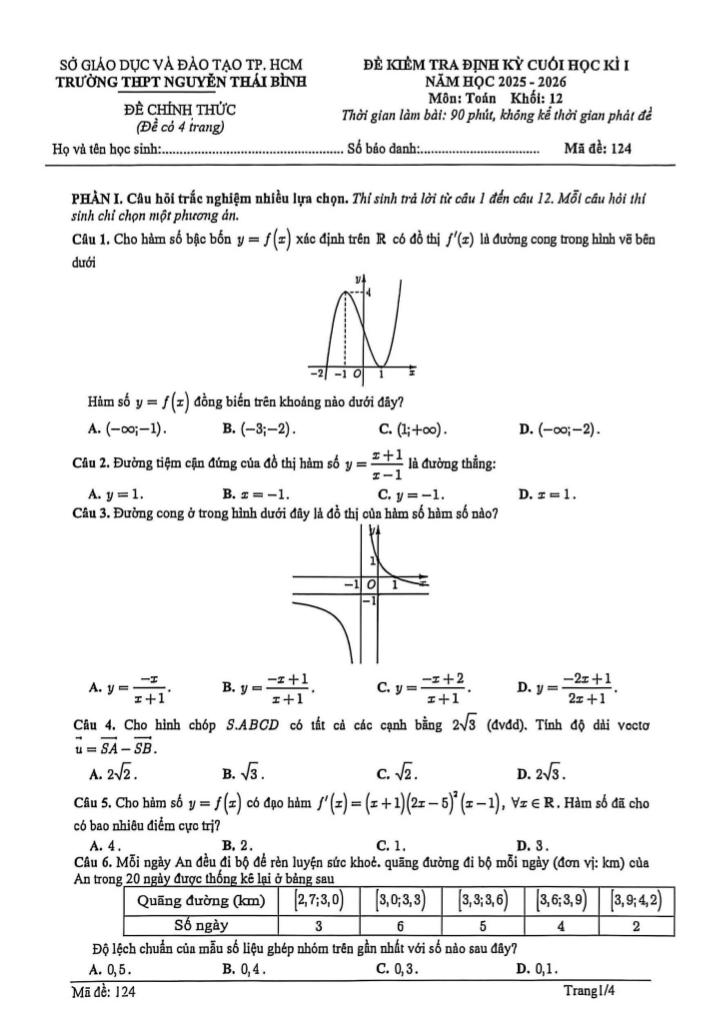 Trích dẫn Đề cuối học kì 1 Toán 12 năm 2025 – 2026 trường THPT Nguyễn Thái Bình – TP HCM: