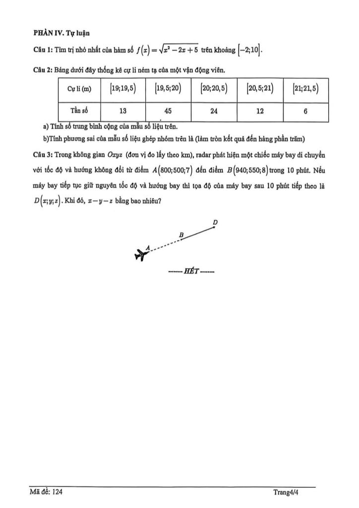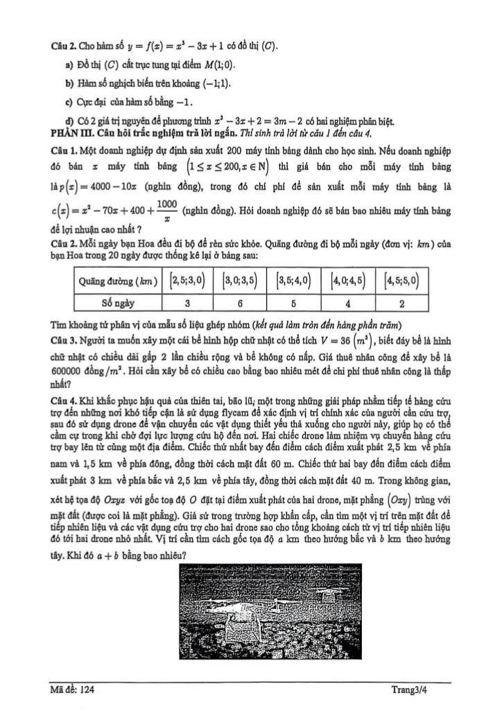 + Khi khắc phục hậu quả của thiên tai, bão lũ, một trong những giải pháp nhằm tiếp tế hàng cứu trợ đến những nơi khó tiếp cận là sử dụng flycam để xác định vị trí chính xác của người cần cứu trợ, sau đó sử dụng drone để vận chuyển các vật dụng thiết yếu thả xuống cho người này, giúp họ có thể cầm cự trong khi chờ đợi lực lượng cứu hộ đến nơi. Hai chiếc drone làm nhiệm vụ chuyển hàng cứu trợ bay lên từ cũng một địa điểm. Chiếc thứ nhất bay đến điểm cách điểm xuất phát 2,5 km về phía nam và 1,5 km về phía đông, đồng thời cách mặt đất 60 m. Chiếc thứ hai bay đến điểm cách điểm xuất phát 3 km về phía bắc và 2,5 km về phía tây, đồng thời cách mặt đất 40 m. Trong không gian, xét hệ tọa độ Oxyz với gốc toạ độ O đặt tại điểm xuất phát của hai drone, mặt phẳng (Oxy) trùng với mặt đất (được coi là mặt phẳng). Giả sử trong trường hợp khẩn cấp, cần tìm một vị trí trên mặt đất để tiếp nhiên liệu và các vật dụng cứu trợ cho hai drone sao cho tổng khoảng cách từ vị trí tiếp nhiên liệu đó tới hai drone nhỏ nhất. Vị trí cần tìm cách gốc tọa độ a km theo hướng bắc và b km theo hướng tây, Khi đó a + b bằng bao nhiêu?