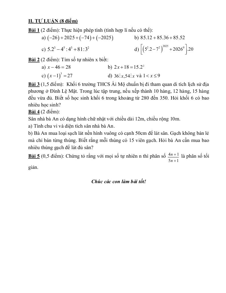 Trích dẫn Đề cuối học kì 1 Toán 6 năm 2025 – 2026 trường THCS Ái Mộ – Hà Nội: