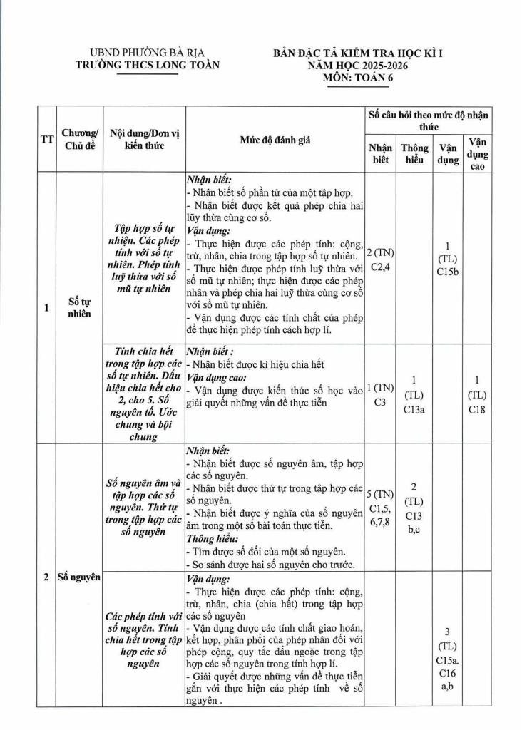 giaitoan.edu.vn giới thiệu đến quý thầy, cô giáo và các em học sinh đề kiểm tra cuối học kì 1 môn Toán 6 năm học 2025 – 2026 trường THCS Long Toàn, phường Bà Rịa, thành phố Hồ Chí Minh. Kỳ thi được diễn ra vào ngày 23 tháng 12 năm 2025.