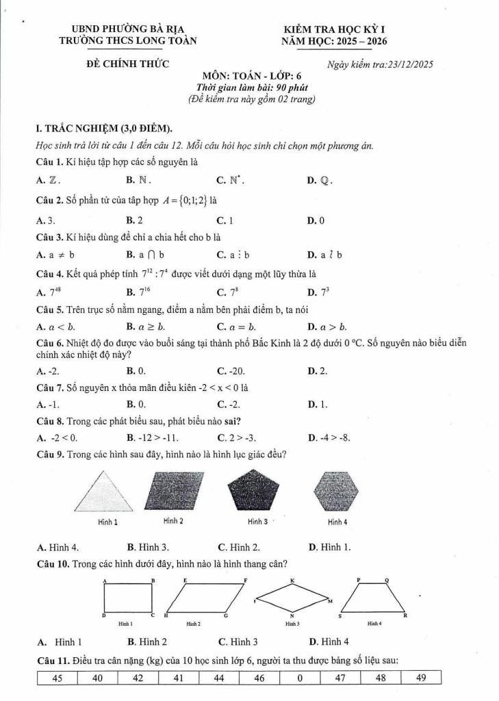 Toán học luôn là một môn học quan trọng, giúp học sinh phát triển tư duy logic và kỹ năng giải quyết vấn đề. Để hỗ trợ các bạn học sinh và giáo viên trong việc học tập và giảng dạy, bài viết này sẽ cung cấp lời giải chi tiết và đáp án chính xác cho chủ đề đề cuối học kì 1 toán 6 năm 2025 – 2026 trường thcs long toàn – tp hcm, giúp bạn hiểu sâu và tự tin hơn khi làm bài tập.