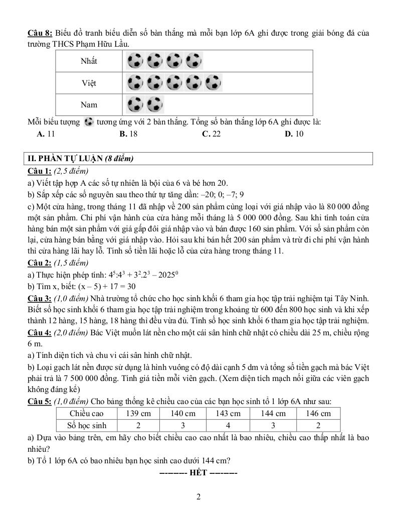 Trích dẫn Đề cuối học kì 1 Toán 6 năm 2025 – 2026 trường THCS Phạm Hữu Lầu – TP HCM: