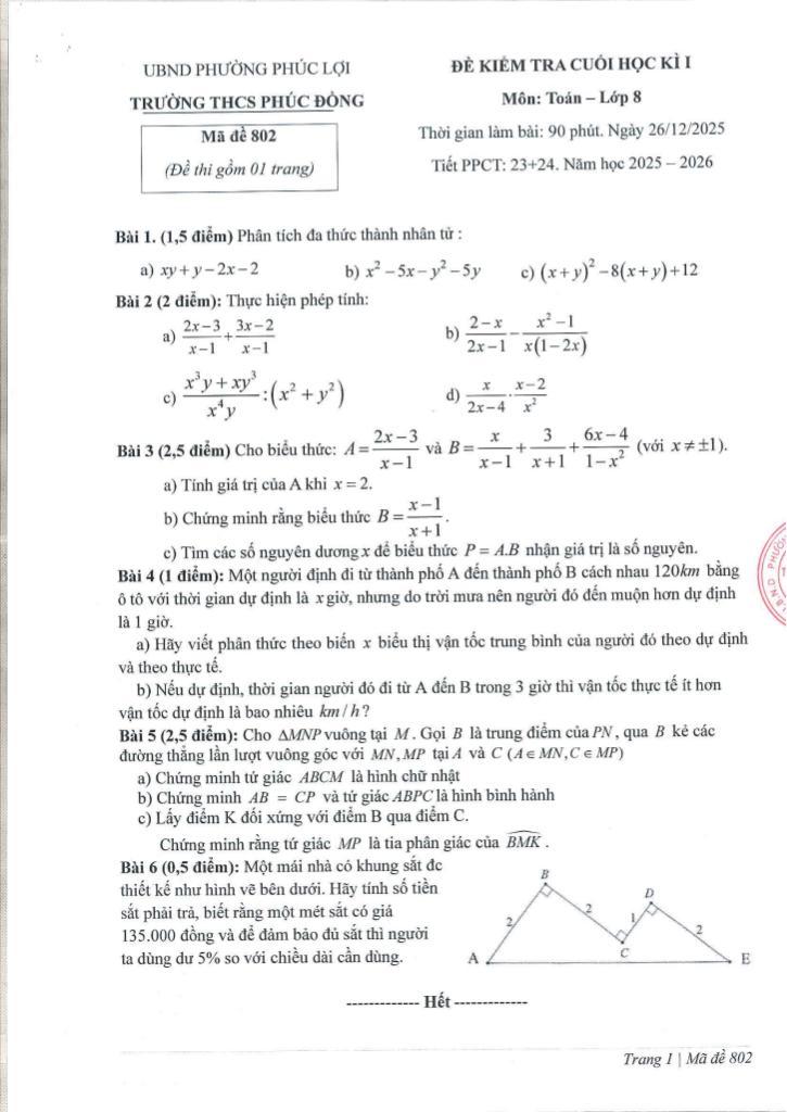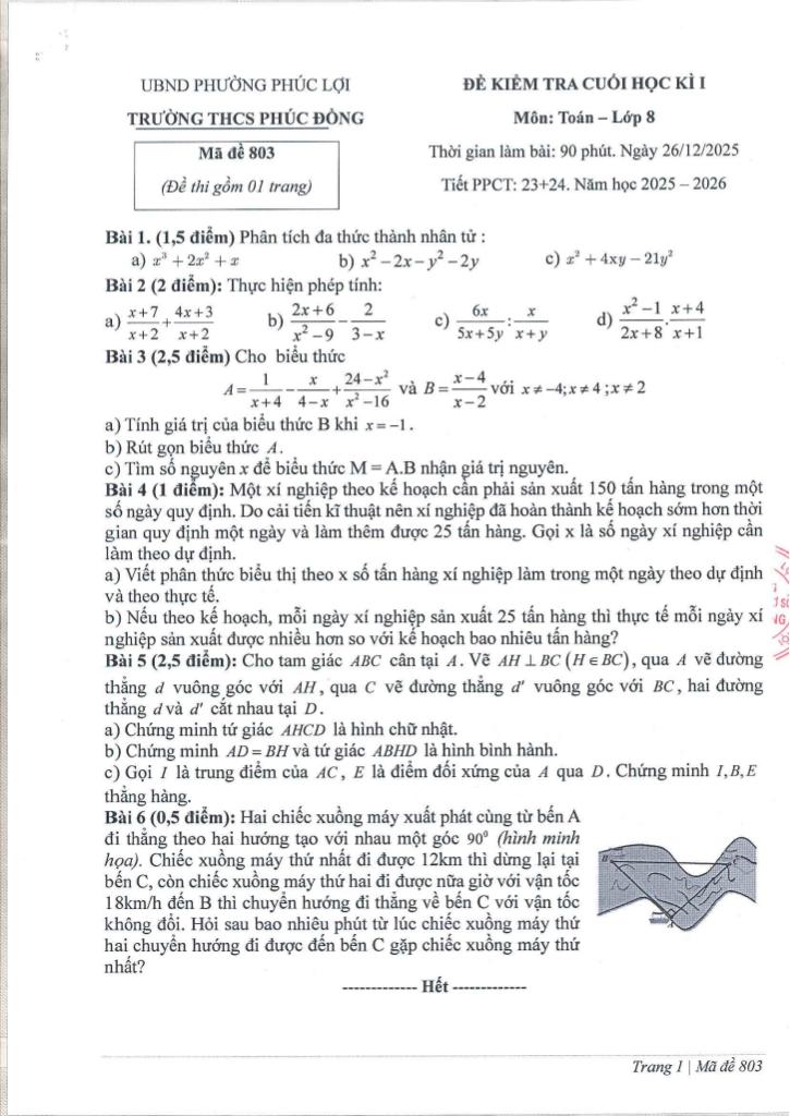 Trích dẫn Đề cuối học kì 1 Toán 8 năm 2025 – 2026 trường THCS Phúc Đồng – Hà Nội: