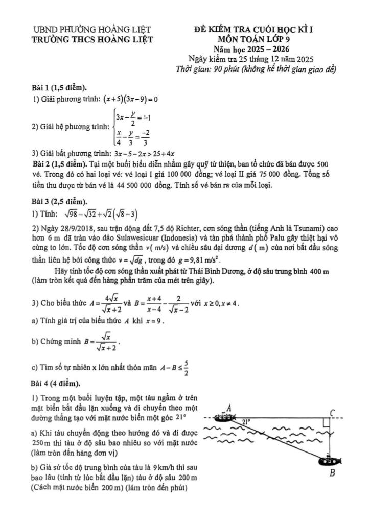 Trích dẫn Đề cuối học kì 1 Toán 9 năm 2025 – 2026 trường THCS Hoàng Liệt – Hà Nội: