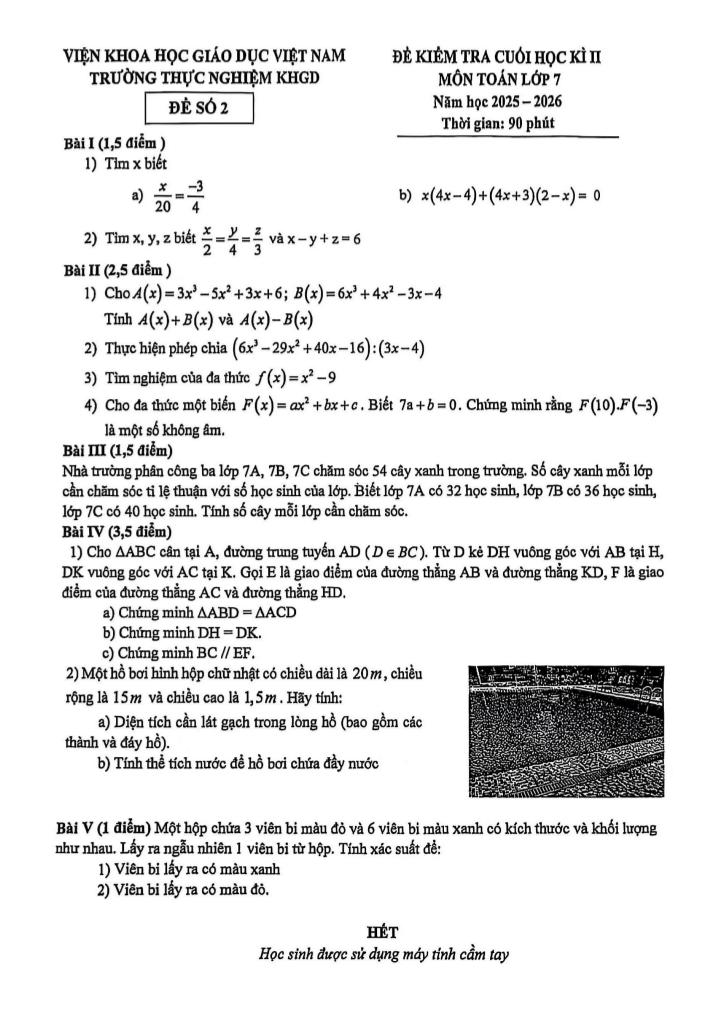giaitoan.edu.vn giới thiệu đến quý thầy, cô giáo và các em học sinh đề kiểm tra cuối học kì 2 môn Toán 7 năm học 2025 – 2026 trường Thực Nghiệm KHGD, Viện Khoa học Giáo dục Việt Nam, thành phố Hà Nội.