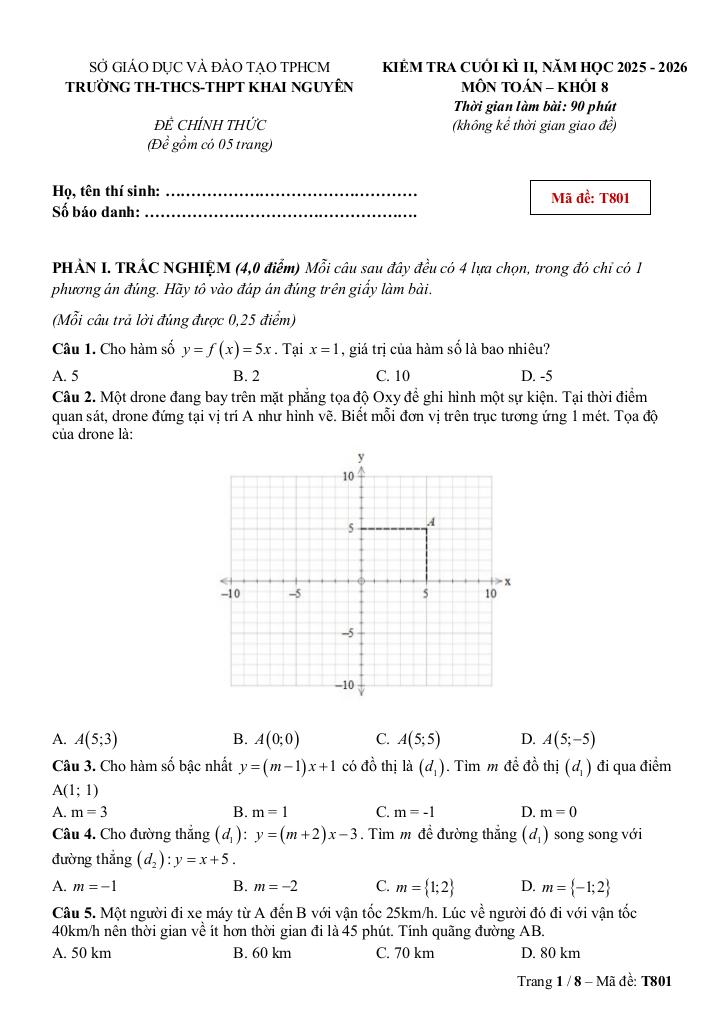 Trích dẫn Đề cuối học kì 2 Toán 8 năm 2025 – 2026 trường Khai Nguyên – TP HCM: