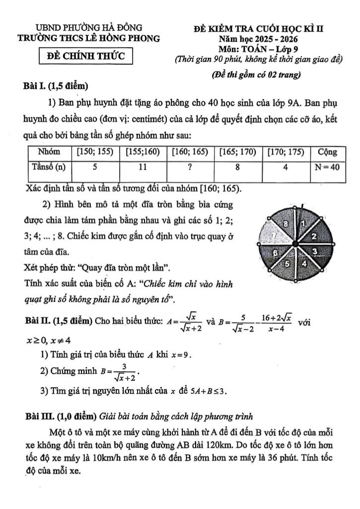 Trích dẫn Đề cuối học kì 2 Toán 9 năm 2025 – 2026 trường THCS Lê Hồng Phong – Hà Nội: