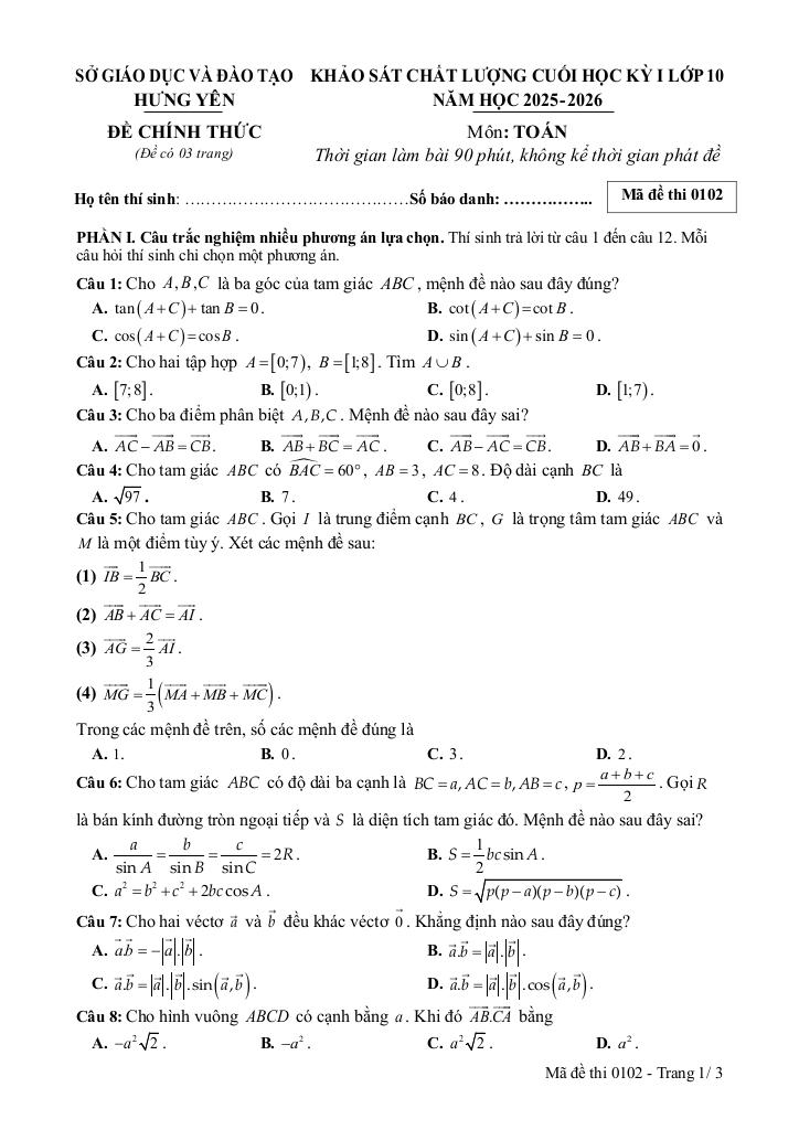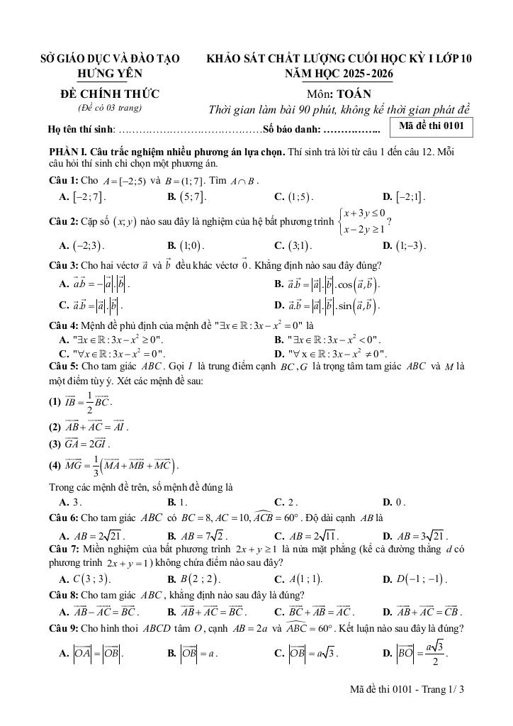 giaitoan.edu.vn giới thiệu đến quý thầy, cô giáo và các em học sinh đề khảo sát chất lượng cuối học kỳ 1 môn Toán 10 năm học 2025 – 2026 sở Giáo dục và Đào tạo tỉnh Hưng Yên. Đề thi có đáp án mã đề 0101 0103 0105 0107 0102 0104 0106 0108.
