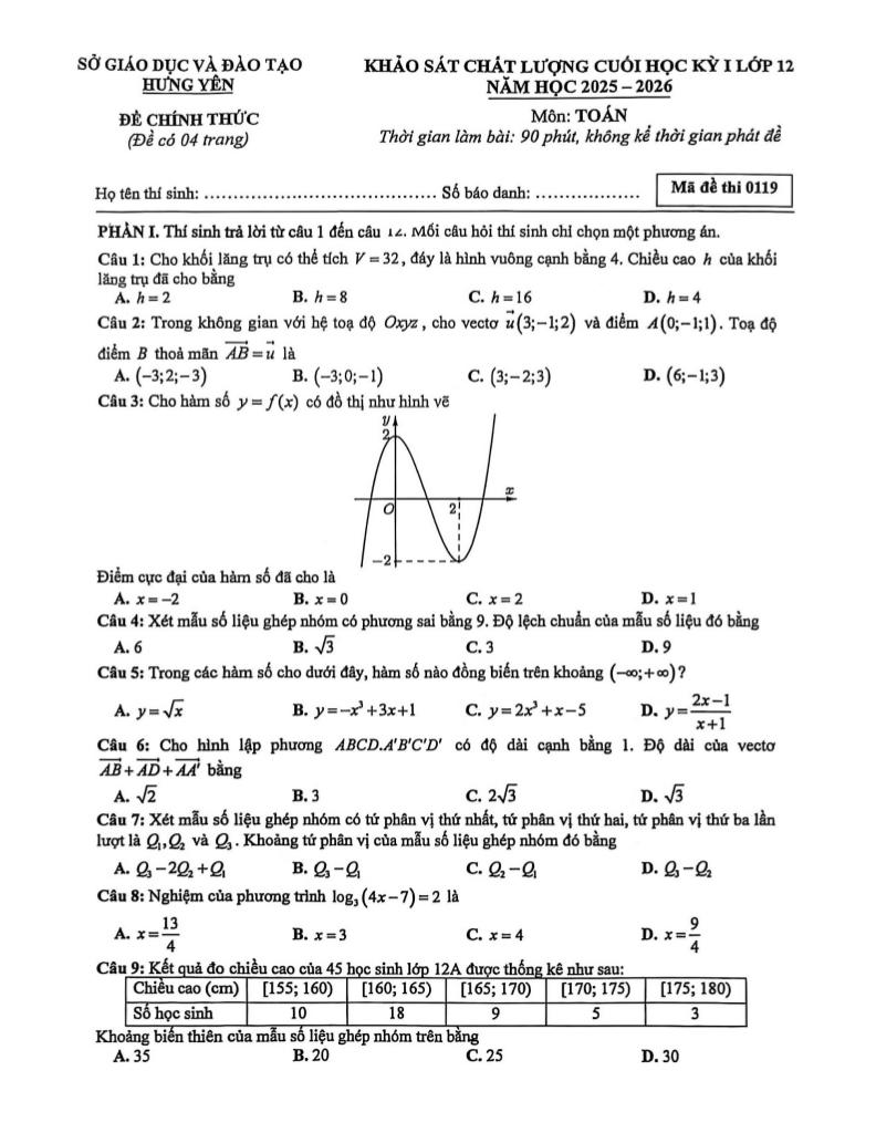 Trích dẫn Đề cuối học kỳ 1 Toán 12 năm 2025 – 2026 sở GD&ĐT Hưng Yên: