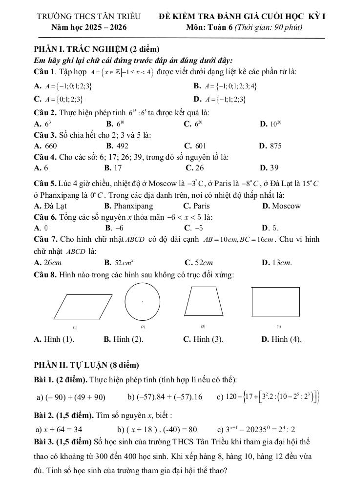 Trích dẫn Đề cuối học kỳ 1 Toán 6 năm 2025 – 2026 trường THCS Tân Triều – Hà Nội: