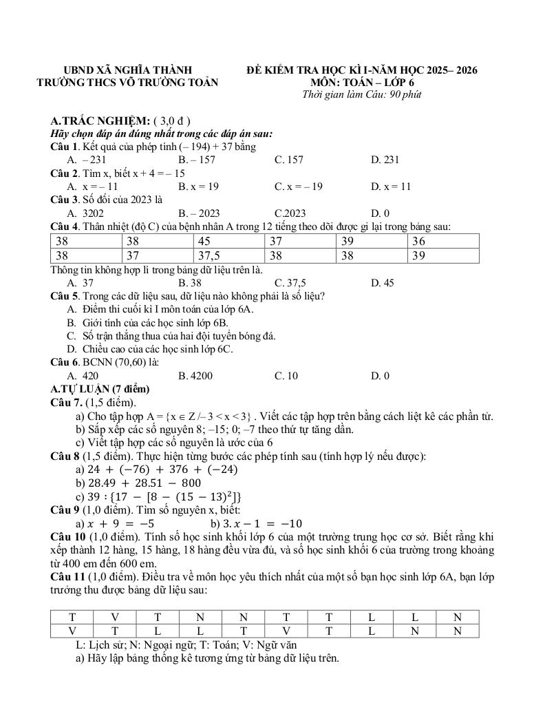 giaitoan.edu.vn giới thiệu đến quý thầy, cô giáo và các em học sinh đề kiểm tra cuối học kỳ 1 môn Toán 6 năm học 2025 – 2026 trường THCS Võ Trường Toản, xã Nghĩa Thành, thành phố Hồ Chí Minh. Đề thi có đáp án và hướng dẫn chấm điểm.