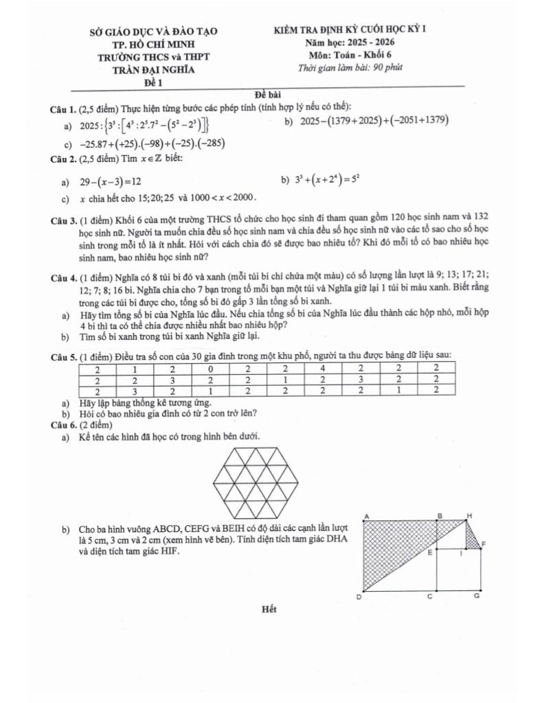 Trích dẫn Đề cuối học kỳ 1 Toán 6 năm 2025 – 2026 trường Trần Đại Nghĩa – TP HCM: