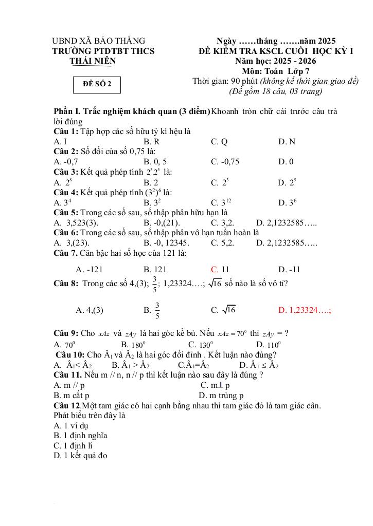 Giải Toán đề cuối học kỳ 1 toán 7 năm 2025 – 2026 trường thcs thái niên – lào cai với Đáp Án Mới Nhất