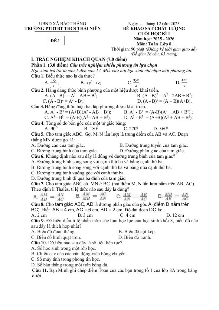 Giải Toán đề cuối học kỳ 1 toán 8 năm 2025 – 2026 trường thcs thái niên – lào cai với Đáp Án Mới Nhất