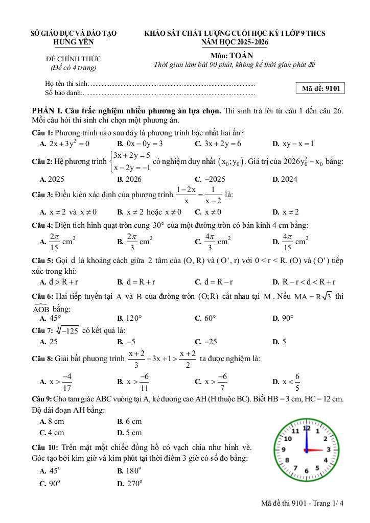 giaitoan.edu.vn giới thiệu đến quý thầy, cô giáo và các em học sinh đề khảo sát chất lượng cuối học kỳ 1 môn Toán 9 năm học 2025 – 2026 sở Giáo dục và Đào tạo tỉnh Hưng Yên. Đề thi gồm 26 câu trắc nghiệm nhiều phương án lựa chọn + 02 câu trắc nghiệm đúng sai + 06 câu trắc nghiệm trả lời ngắn, thời gian làm bài 90 phút, có đáp án mã đề 9101 – 9102 – 9103 – 9104.