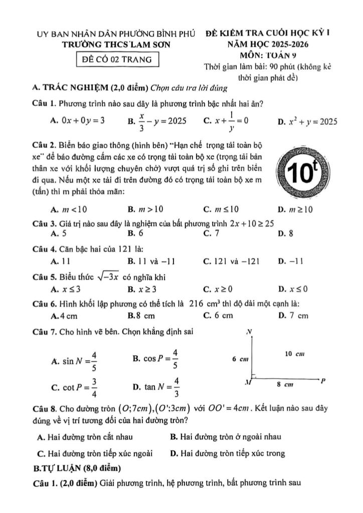 giaitoan.edu.vn giới thiệu đến quý thầy, cô giáo và các em học sinh đề kiểm tra cuối học kỳ 1 môn Toán 9 năm học 2025 – 2026 trường THCS Lam Sơn, phường Bình Phú, thành phố Hồ Chí Minh. Đề thi hình thức 20% trắc nghiệm kết hợp với 80% tự luận, thời gian làm bài 90 phút.