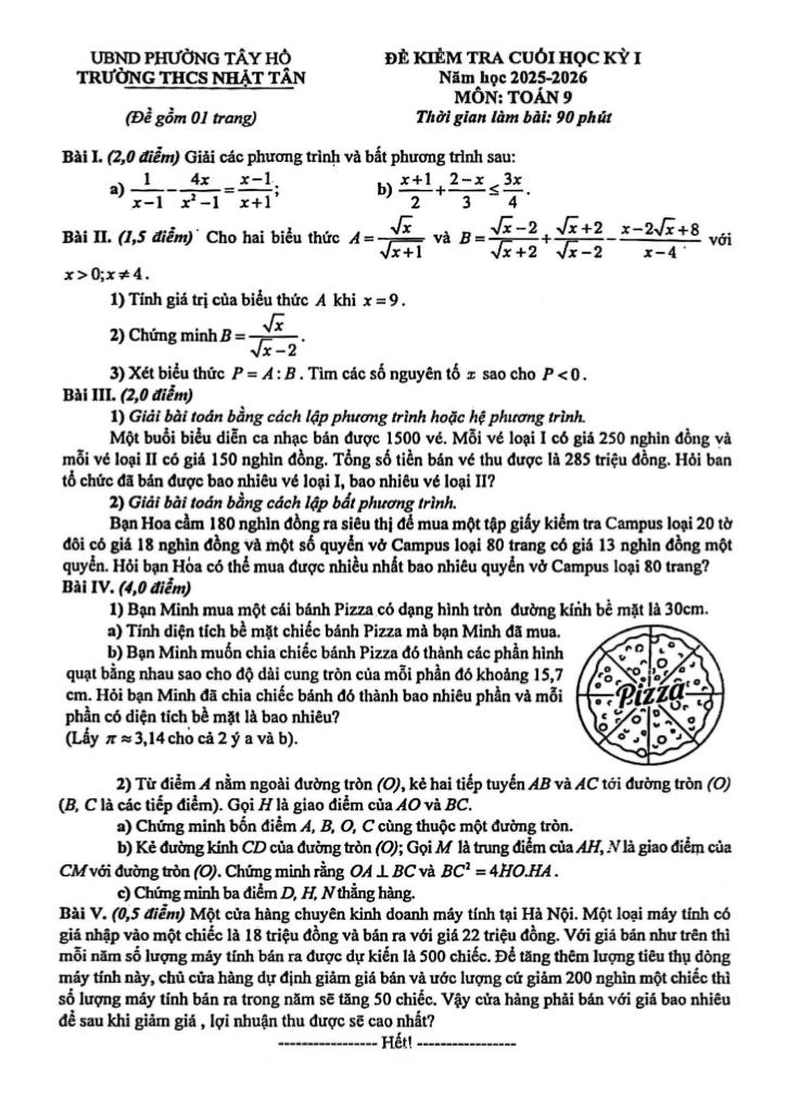 Trích dẫn Đề cuối học kỳ 1 Toán 9 năm 2025 – 2026 trường THCS Nhật Tân – Hà Nội: